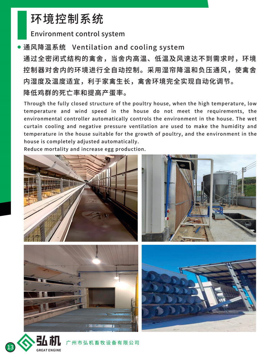 Through the fully closed structure of the poultry house, when the high temperature, low temperature and wind speed in the house do not meet the requirements, the environmental controller automatically controls the environment in the house. The wet curtain cooling and negative pressure ventilation are used to make the humidity and temperature in the house suitable for the growth of poultry, and the environment in the house is completely adjusted automatically.
